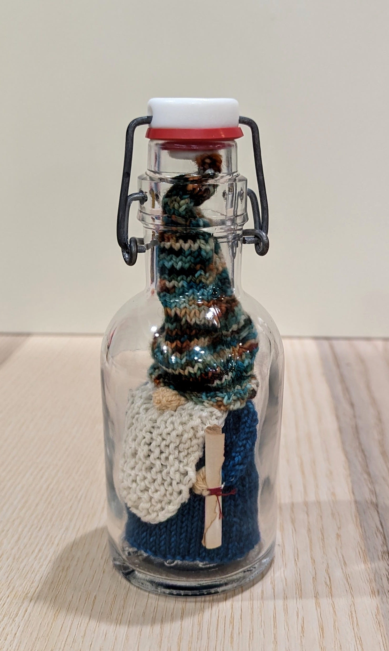 After 99 gnomes I was comfortable enough with the structure of the pattern to make the necessary adjustments. So, to celebrate Knit for Food in 2024, I set out on a mission to make a gnome in a bottle. I cast on first thing in the morning and by the mid-afternoon, I had succeeded. The Gnome was in the Bottle.
