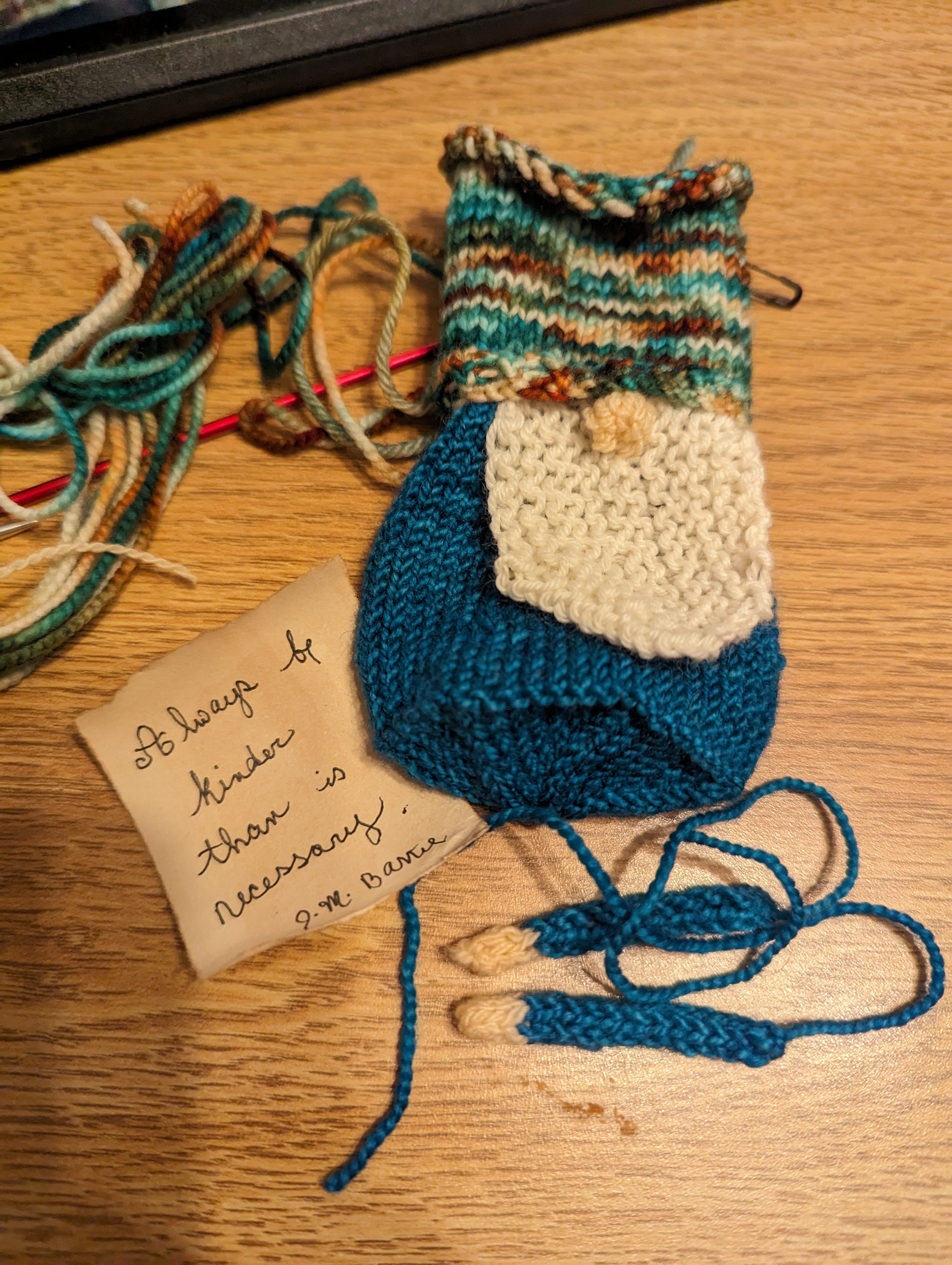 I heard from a couple of you that you want to see more gnomes. There will be more gnomes. I have a couple of plans for gnome content, and the 124th gnome is on the needles. Today I am going to show just one. The 100th Gnome. As my kids would say “He’s just a special little guy.”