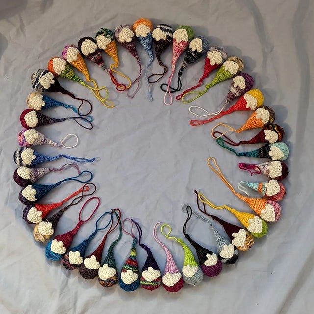 In the Year of Gnomes 2022, I made the Dumplings; 40 little tree-trim gnomes. I did a few every month. Each Dumpling took only about 45 minutes to make.