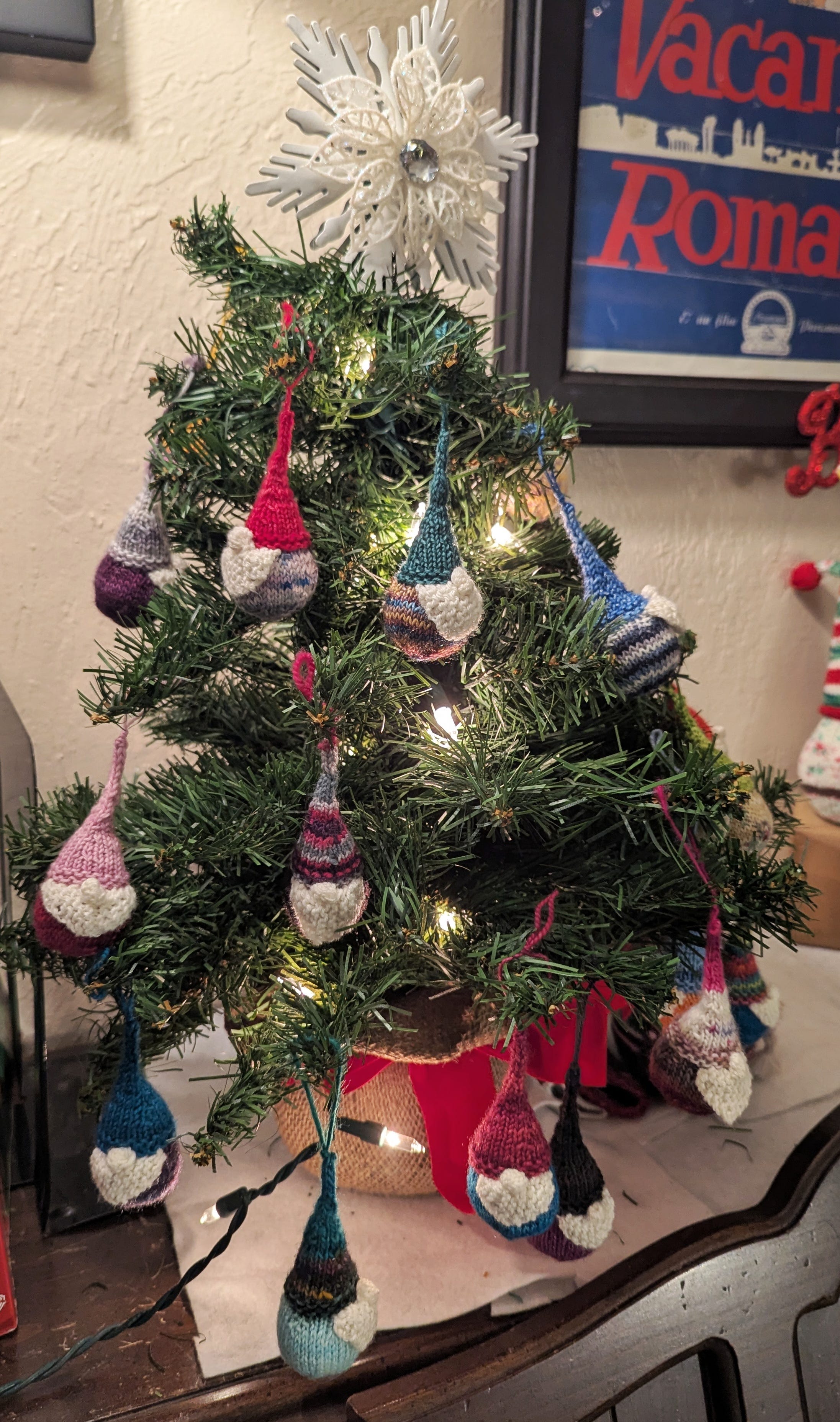 Finally, we have this year’s Advent Gnome. He was finished on the 21st, which Gnomes celebrate as Longest Gnight. If you are knitting him and haven’t seen the finished gnome, stop reading here. Click away!