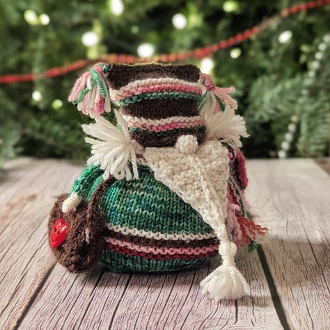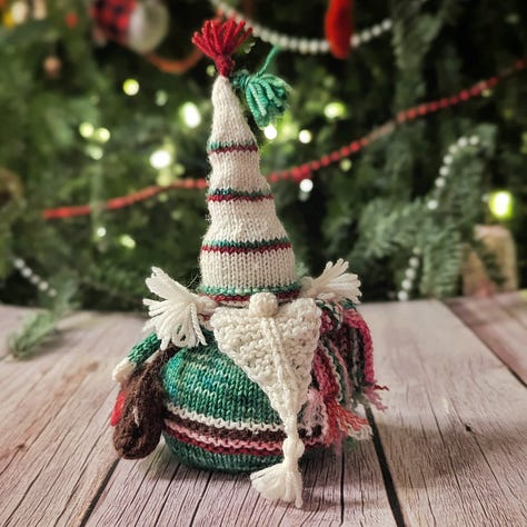 .In December of 2020, Sarah Schira announced an Advent Gnome Mystery Knit Along. And you know that, in addition to loving gnomes, I also love a good knit-along. Every day brought a new piece of the Advent Gnome: some days a knitting clue, some days a bit of a story introducing the gnome, some days a recipe or other goodie. It was too much fun and I was hooked. That first Advent Gnome ended up being the January Gome (Gnova, GN10), but I started thinking about Gnomes and Christmas…